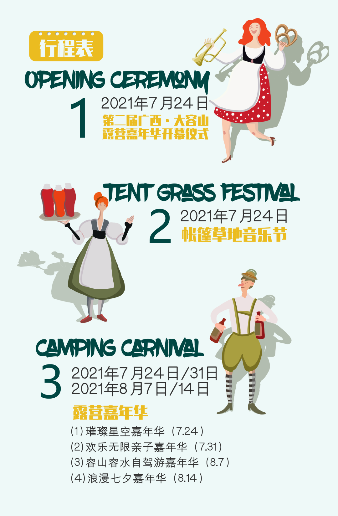 错过了开幕首周活动的朋友们也无须拍大腿!因为接下来我们还有更多精彩的活动!欢乐无限亲子嘉年华、容山容水自驾游嘉年华、浪漫七夕嘉年华三大主题露营周将陆续开展,还有美食狂欢、户外拓展、观赏云海日出等配套活动,千万别错过哦,我们在大容山等你来嗨!